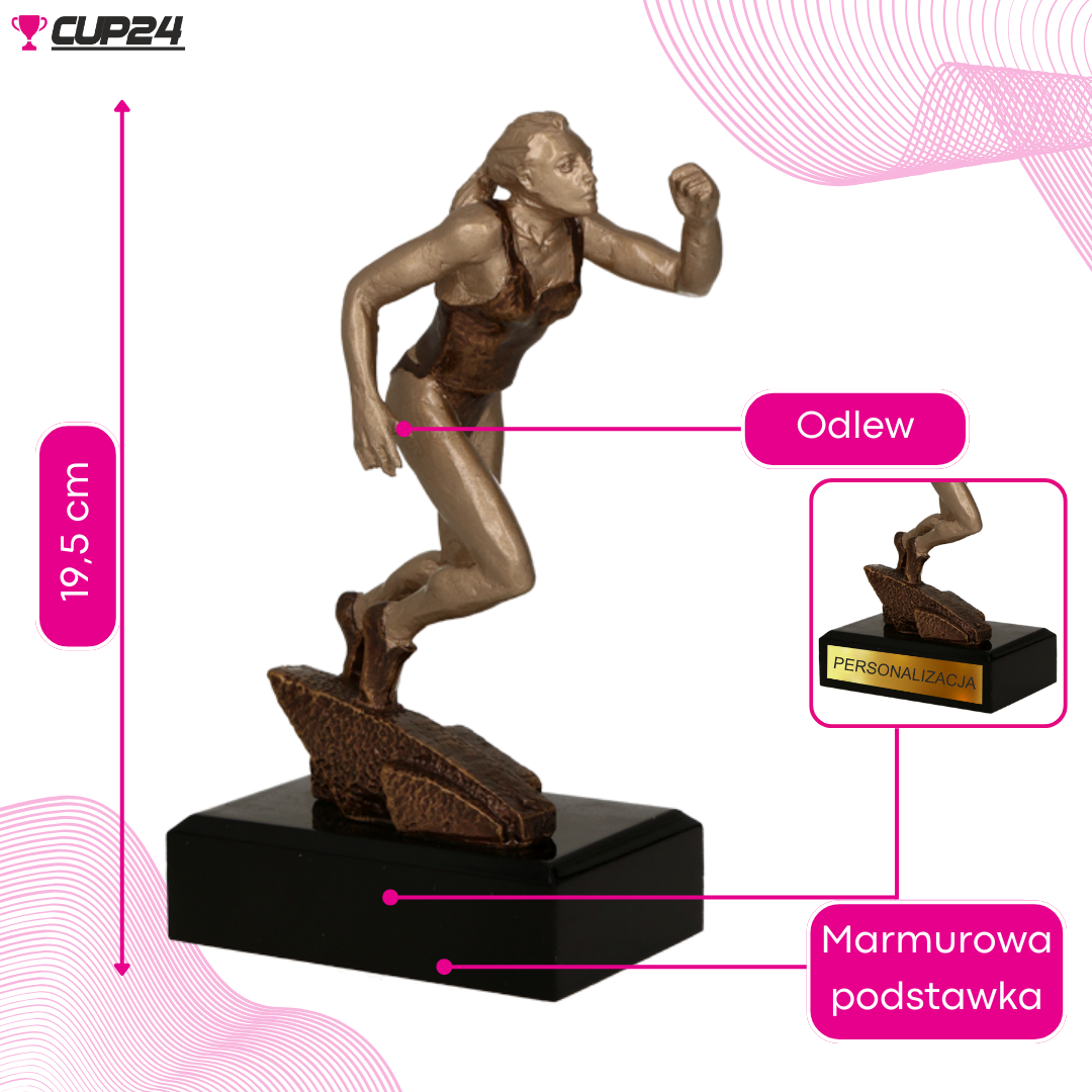 Figurka odlewana - biegaczka to nie tylko piękna nagroda za sportowe osiągnięcia, ale także trwała pamiątka, która będzie przypominać o pasji do biegania i odnoszonych sukcesach. Jest to doskonały sposób na uhonorowanie ciężkiej pracy i zaangażowania w rozwijanie swoich umiejętności oraz zdrowego stylu życia.