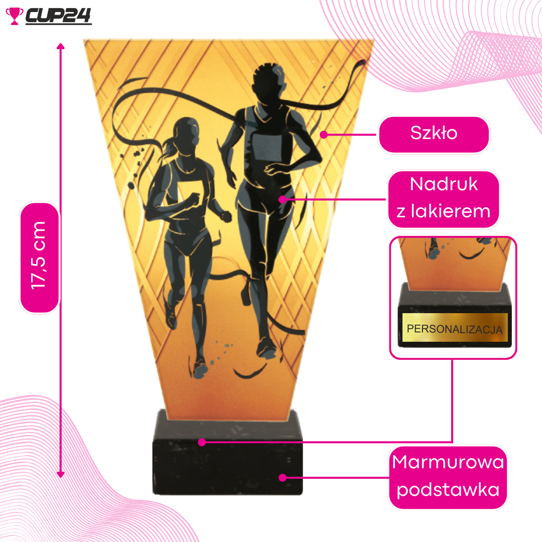 Wykonane z grubego szkła, trofeum V-Line zachwyca pięknym połyskiem i głębią kolorów. Oryginalny wzór z motywem biegów, naniesiony na szkło, nadaje trofeum unikalnego i sportowego charakteru, co sprawia, że jest ono nie tylko nagrodą, ale także wartościowym elementem dekoracyjnym.