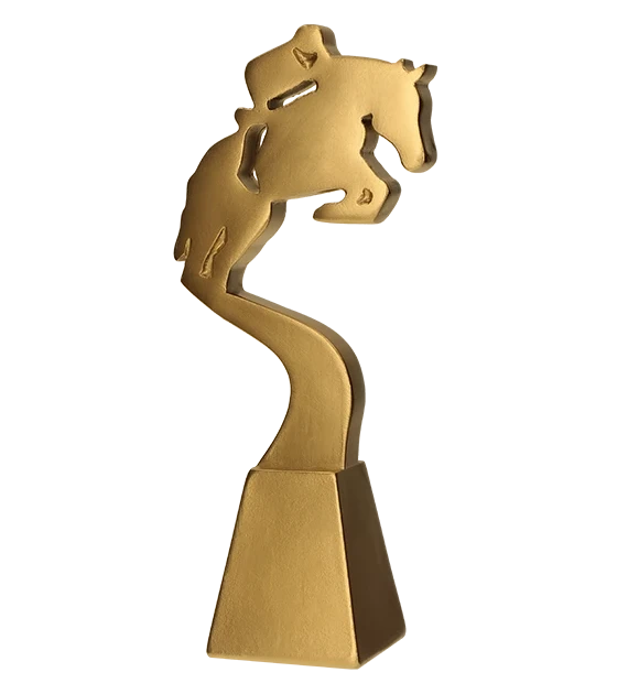 Statuetka jeździecka RP5023-23/G to wspaniała nagroda dla każdego miłośnika jeździectwa. Jej kształt przedstawia scenę z zawodów jeździeckich, gdzie jeździec i koń pokonują przeszkodę. Statuetka jest odlewana z żywicy o złotym kolorze, która nadaje jej blask i prestiż. Na podstawie statuetki można umieścić tabliczkę z dowolnym tekstem, który będzie upamiętniał osiągnięcia i zasługi nagrodzonego. Możesz wybrać między grawerem laserowym a nadrukiem kolorowym, aby nadać tabliczce indywidualny charakter. Statuetka ma 23 cm wysokości i jest dostępna w kategorii statuetek odlewanych. To idealna nagroda dla każdego, kto chce docenić czyjąś pasję i umiejętności w jeździectwie.