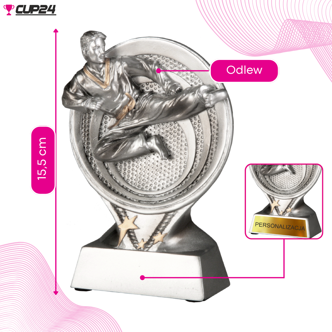 Srebrna figurka z żywicy to więcej niż tylko nagroda - to wyraz uznania dla pracy, poświęcenia i pasji karateków. Zamów już dziś, aby sprawić radość i docenić mistrzów sztuki walki, podkreślając ich wyjątkowe osiągnięcia i wkład w rozwój karate. Jest to prezent, który z pewnością zostanie zapamiętany i ceniony przez każdego, kto go otrzyma.