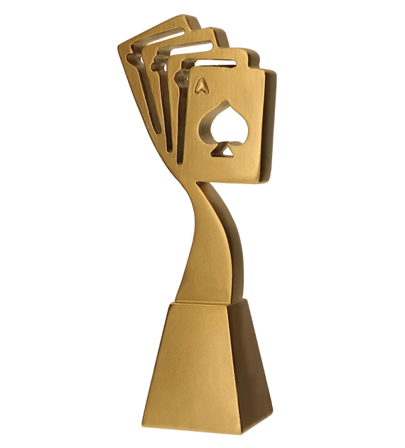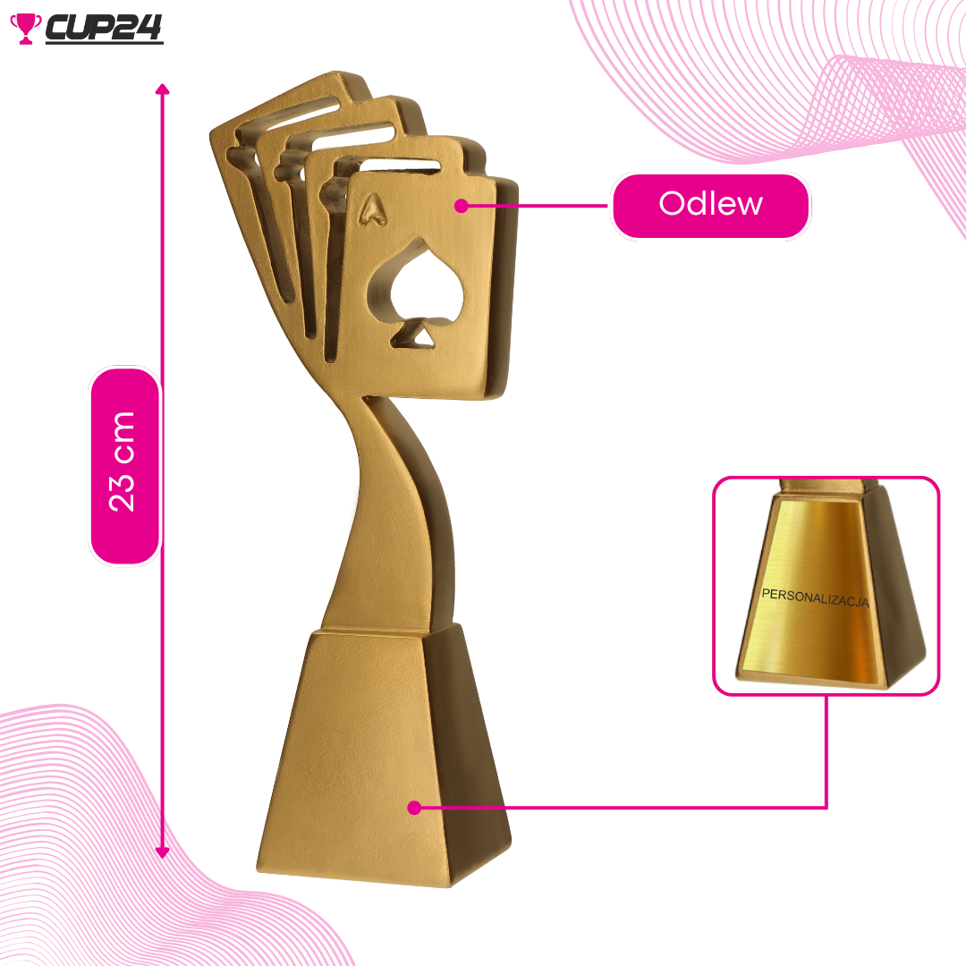 Kształt statuetki, przedstawiający cztery karty do gry, jest bezpośrednim nawiązaniem do świata gier karcianych, symbolizując różnorodność kolorów i wartości. Jest to piękne odzwierciedlenie pasji, strategii i umiejętności, które są nieodłącznymi elementami każdej gry karcianej.