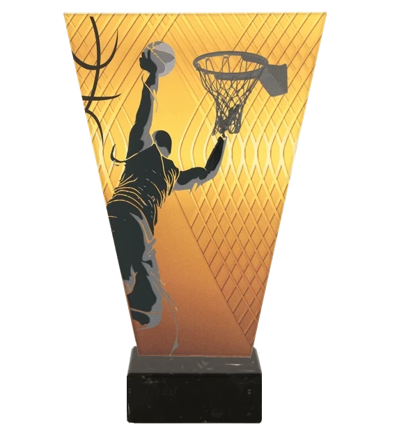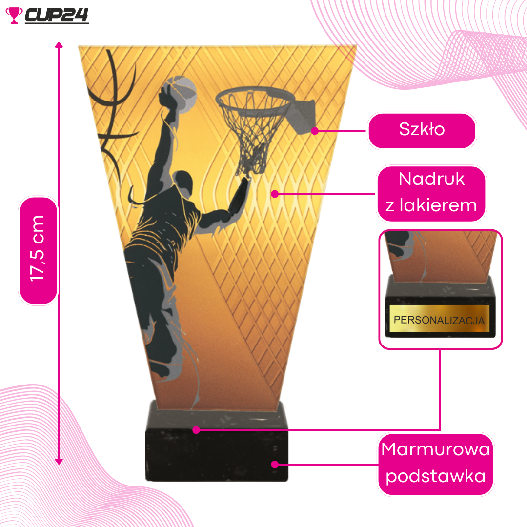 Wykonana z grubego szkła, statuetka zachwyca swoim pięknym połyskiem i głębią kolorów. Oryginalny wzór z motywem koszykówki dodaje trofeum wyjątkowego charakteru, idealnie nawiązując do dynamiki i emocji towarzyszących temu sportowi.