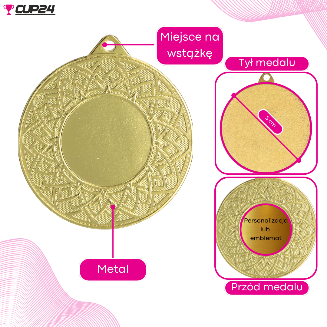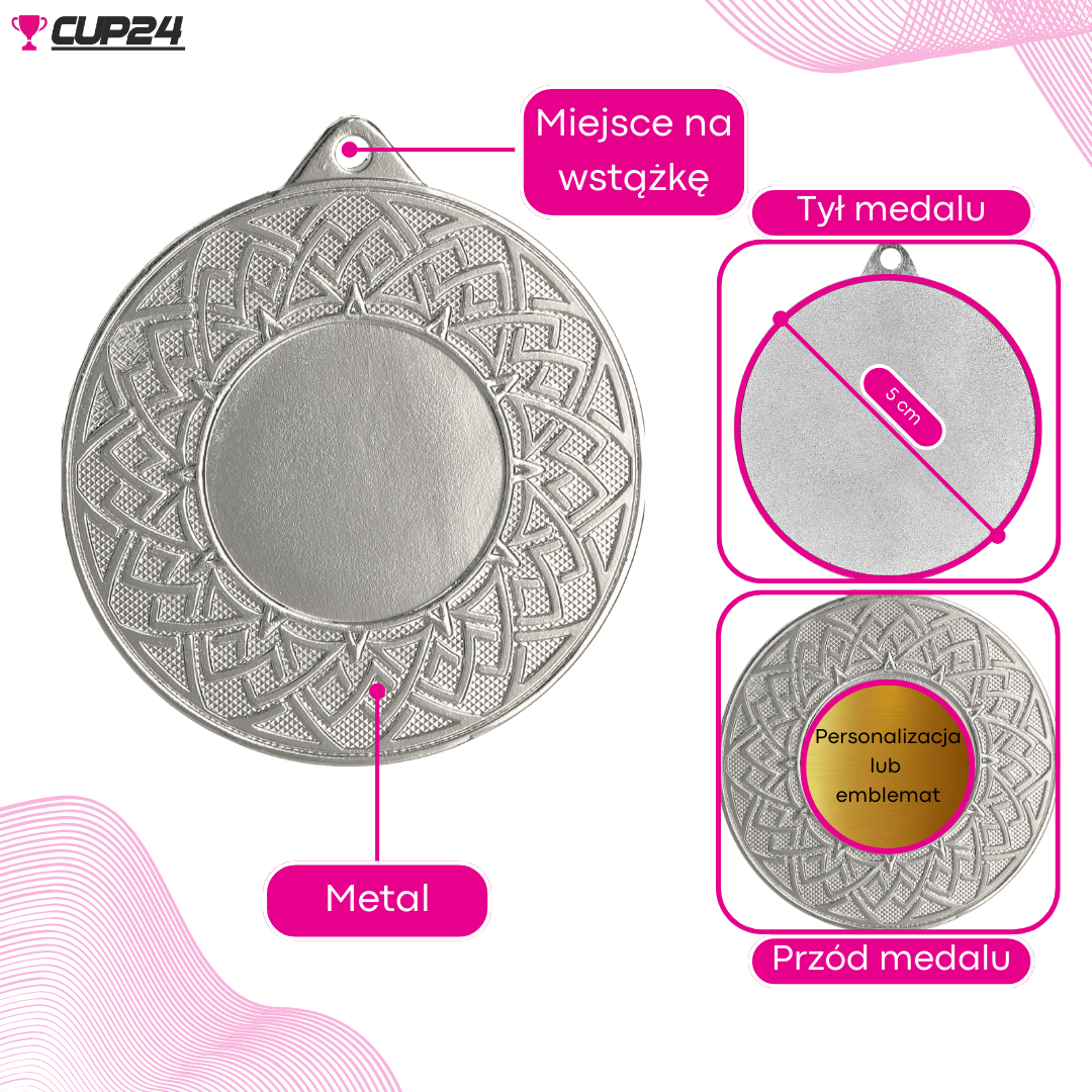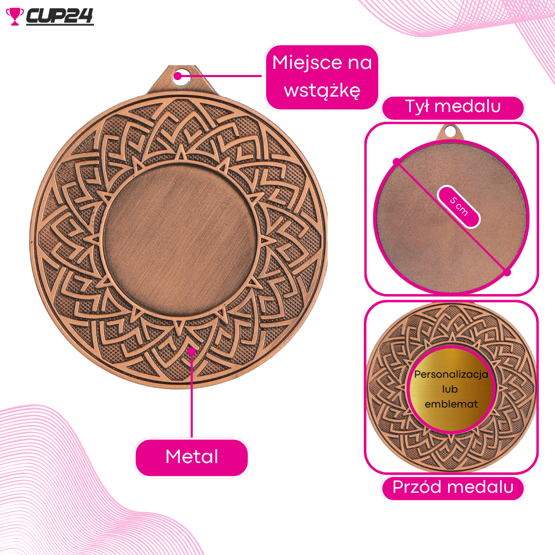 Na awersie znajduje się miejsce na aluminiową wklejkę o średnicy 25 mm, która może przedstawiać dowolną dyscyplinę sportową, np. bieganie, piłkę nożną czy siatkówkę. Dostępne są gotowe wzory, a także opcja zaprojektowania własnej grafiki. Rewers medalu oferuje możliwość dodania dowolnej dedykacji lub logo organizatora imprezy.
