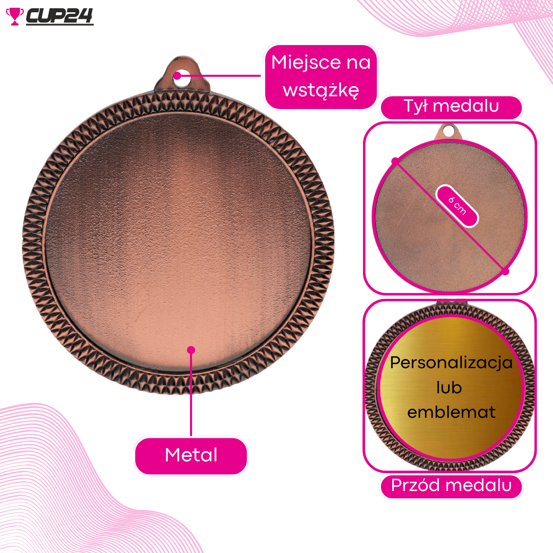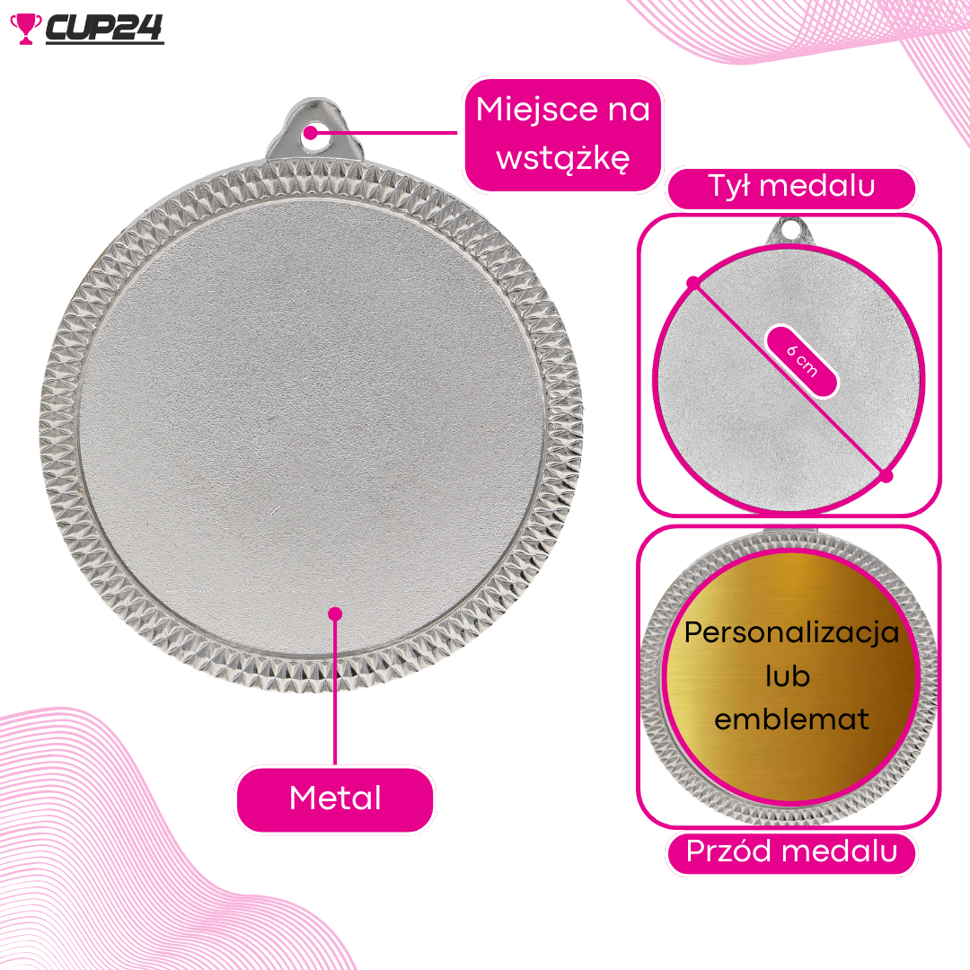 Na awersie medalu można umieścić emblemat o średnicy 50 mm, który może przedstawiać logo organizatora, dyscyplinę sportową, symbol lub napis. Rewers oferuje miejsce na dowolną grafikę lub tekst, np. nazwę zawodów, datę, kategorię, miejsce lub imię i nazwisko laureata.