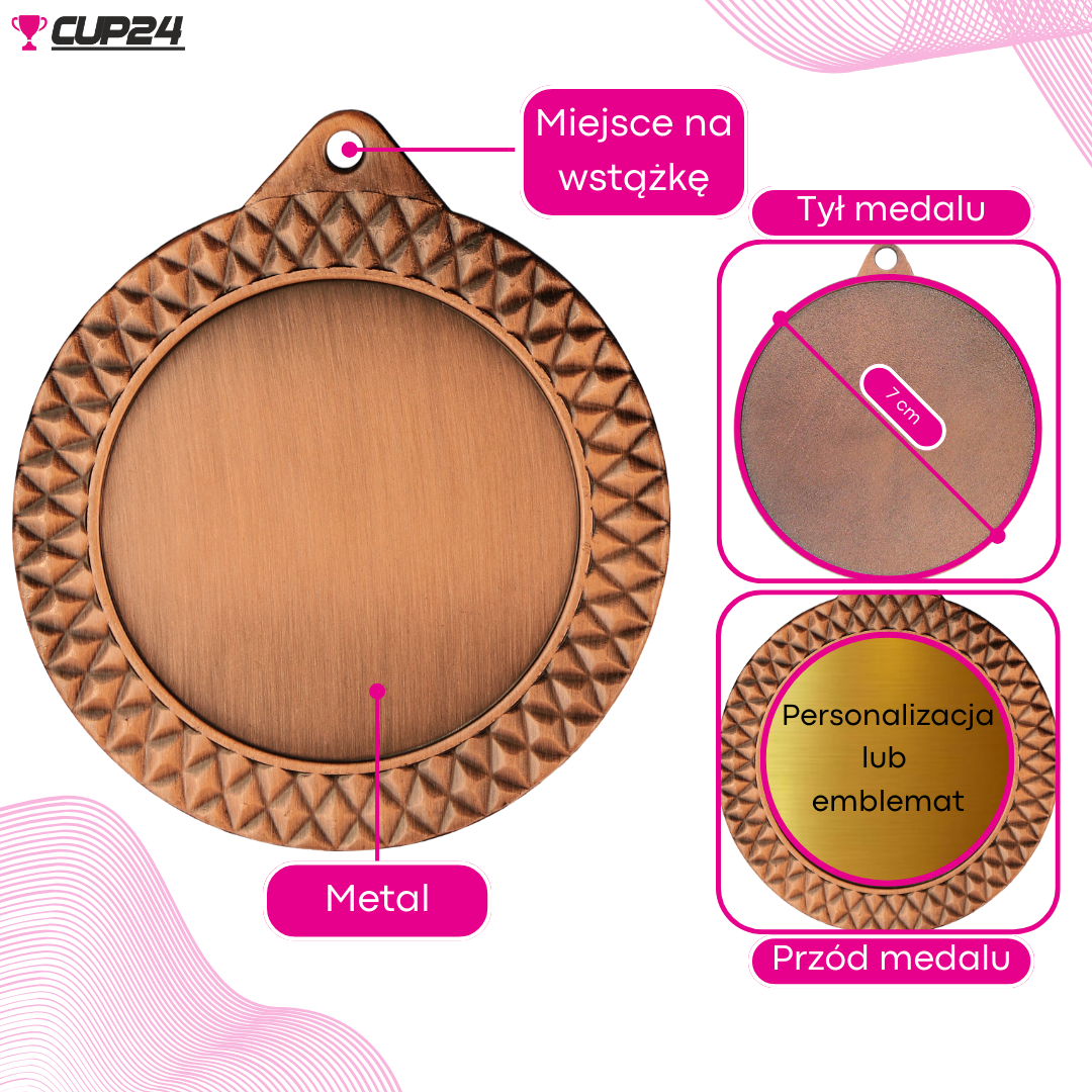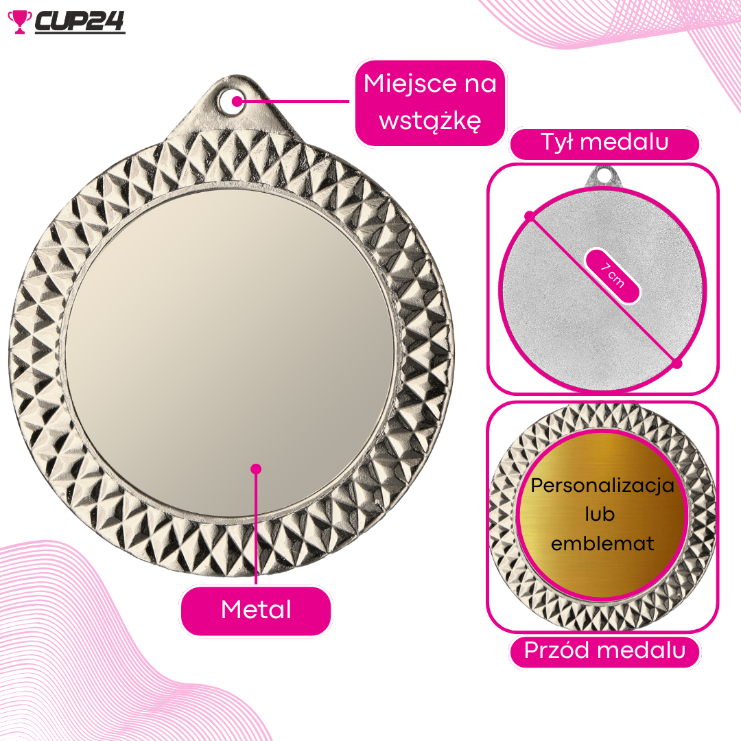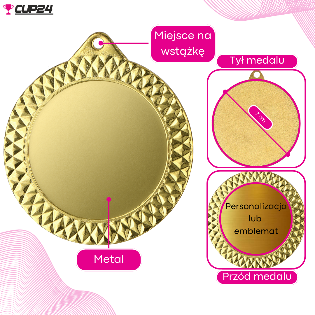 Medal jest wykonany z trwałego, błyszczącego metalu o średnicy 70 mm i grubości 2 mm, co czyni go dużym i efektownym. Jego eleganckie zdobienia podkreślają wartość i prestiż.