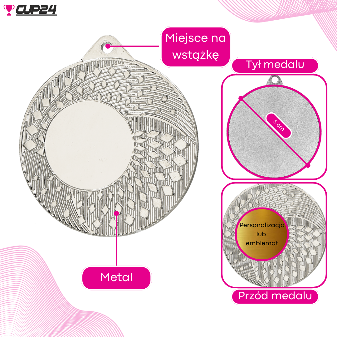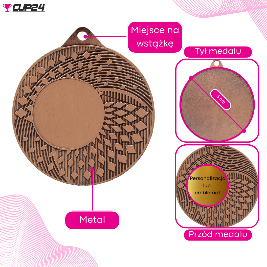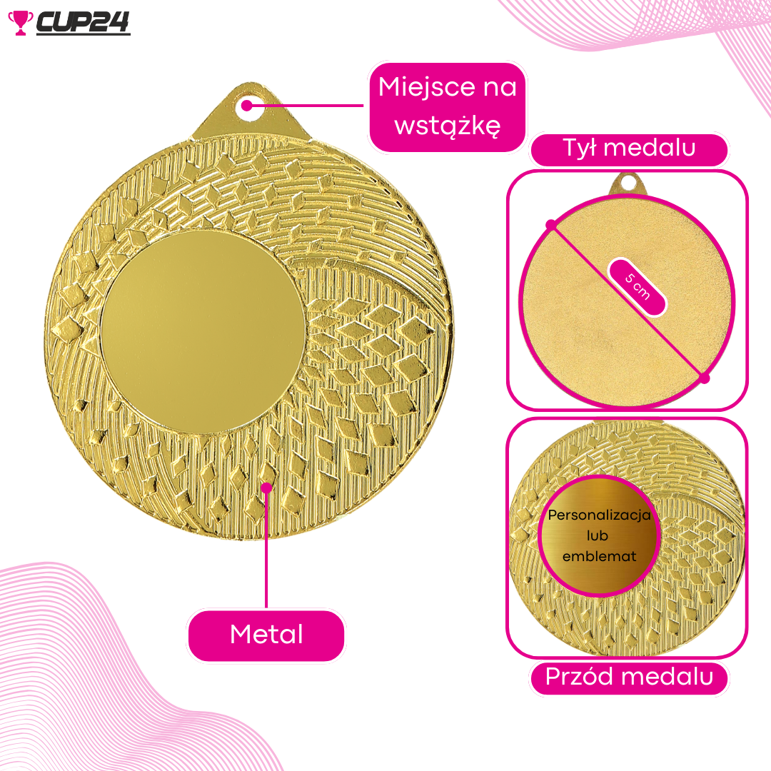 Medal, który dowolnie spersonalizujesz to niepowtarzalna nagroda, która odzwierciedla Twoją kreatywność i wyjątkowość. Wykonany z solidnej stali, ma średnicę 50 mm i grubość 2 mm. Dostępny jest w trzech kolorach: złotym, srebrnym i brązowym, oznaczających kolejność miejsc na podium.