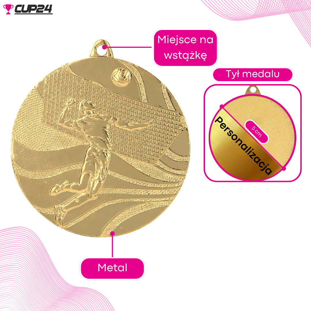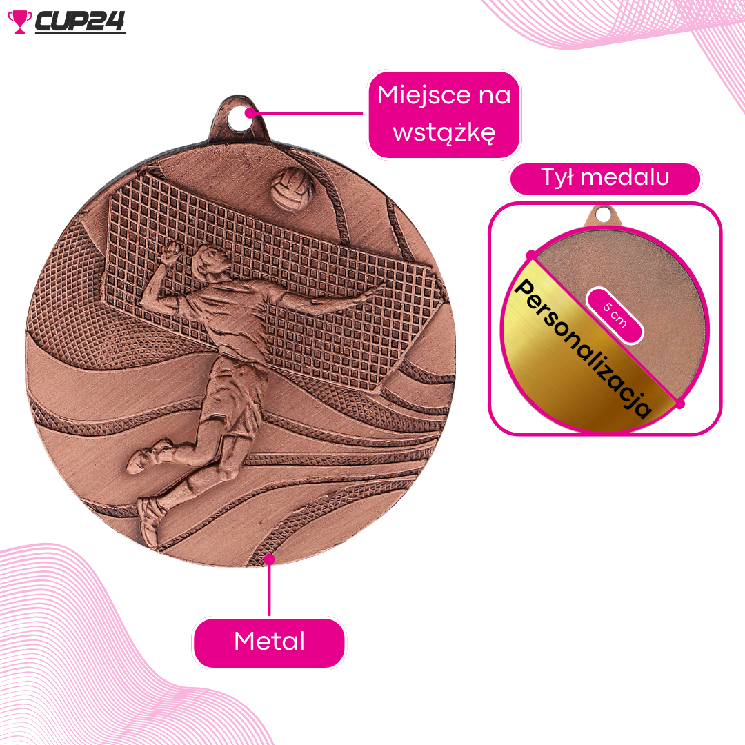 Na awersie medalu widnieje napis „Piłka siatkowa” oraz piękny relief przedstawiający siatkarza w ruchu. Na rewersie można umieścić dowolną dedykację lub logo organizatora imprezy, dodając osobisty charakter tej nagrodzie. Medal jest uzupełniony o kolorową wstążkę z karabińczykiem, umożliwiającą łatwe zawieszenie medalu na szyi.