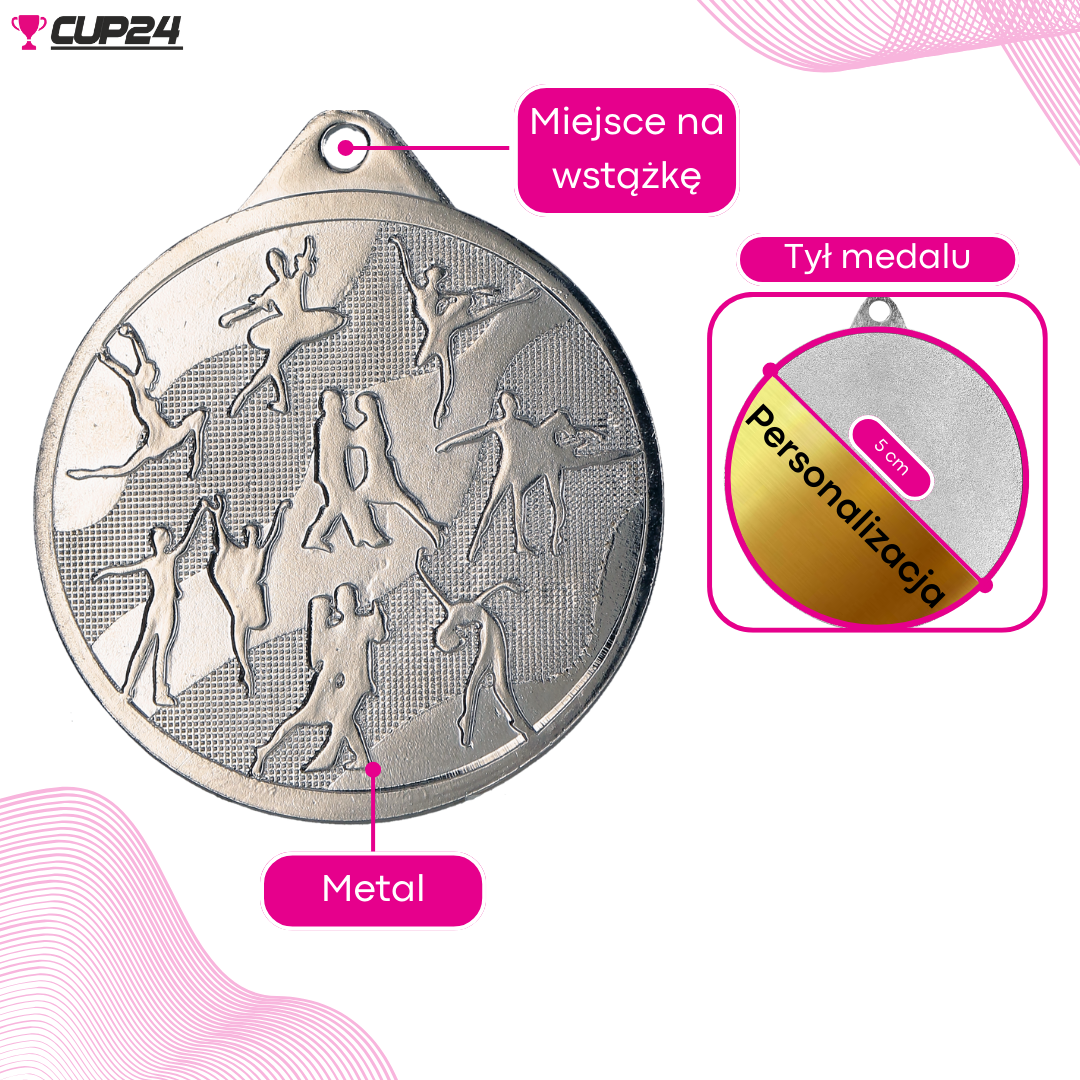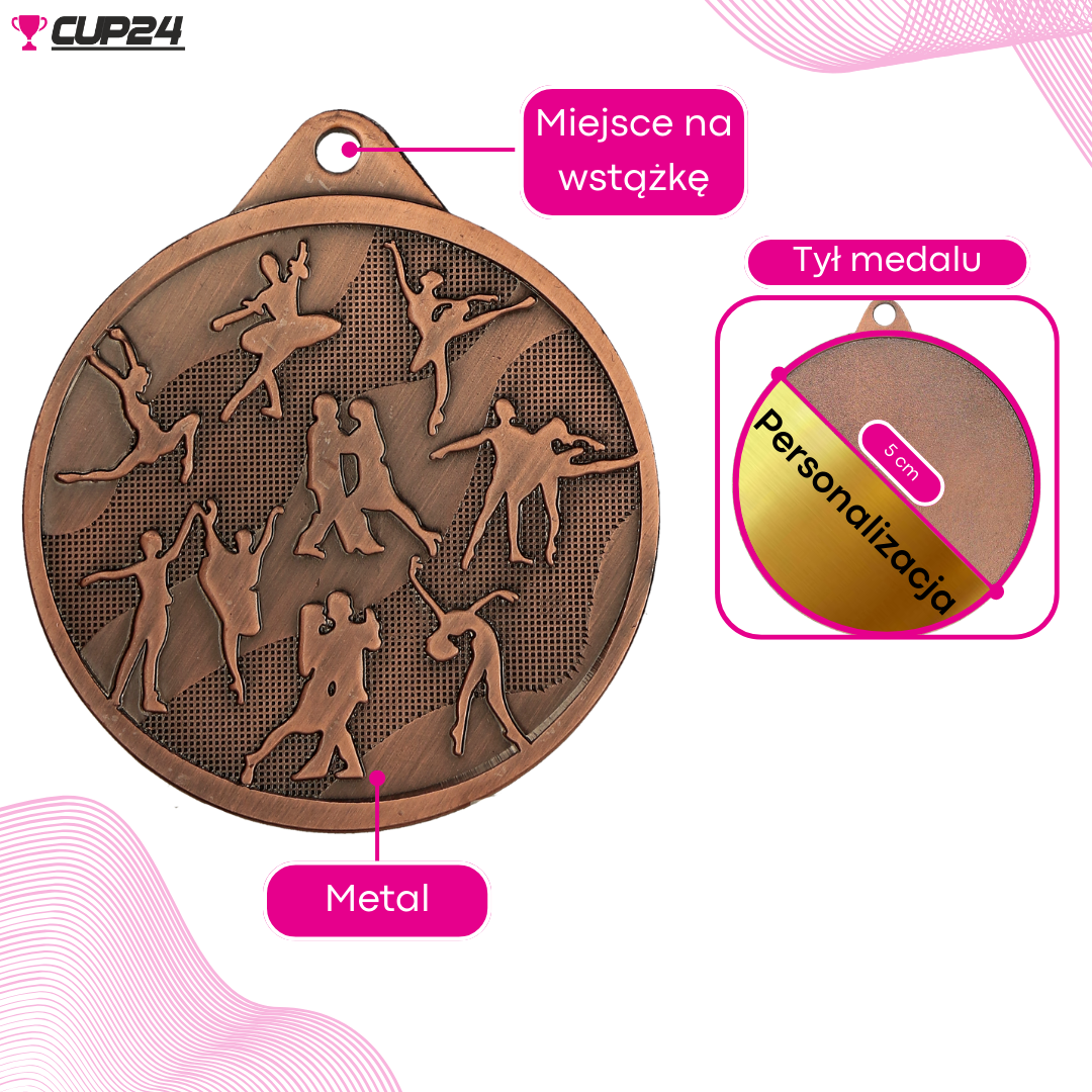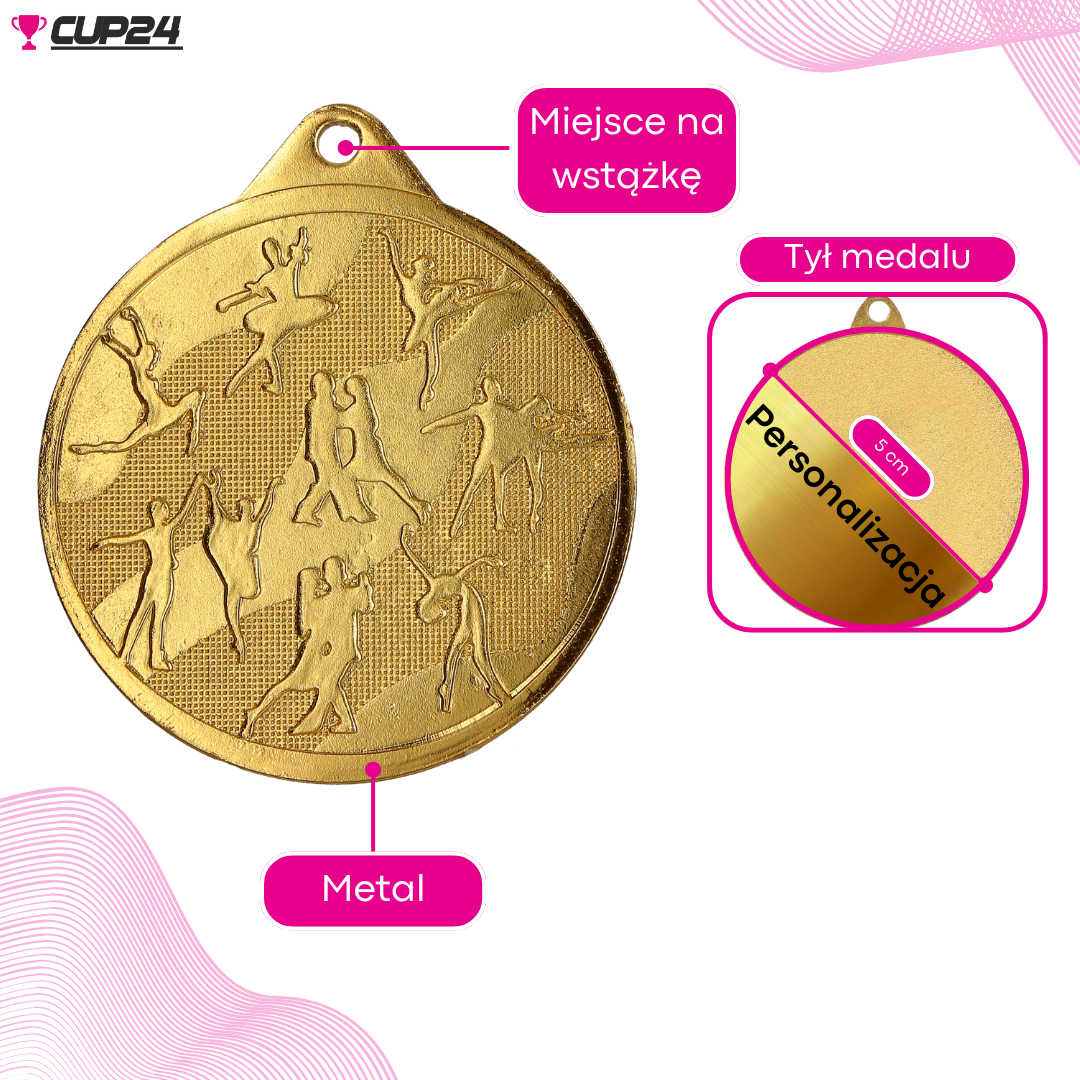 Medal nie ma miejsca na emblemat, ale można go spersonalizować poprzez wygrawerowanie dowolnego tekstu lub numeru na rewersie. To doskonały sposób na wyróżnienie tancerzy za ich osiągnięcia, talent i pasję.