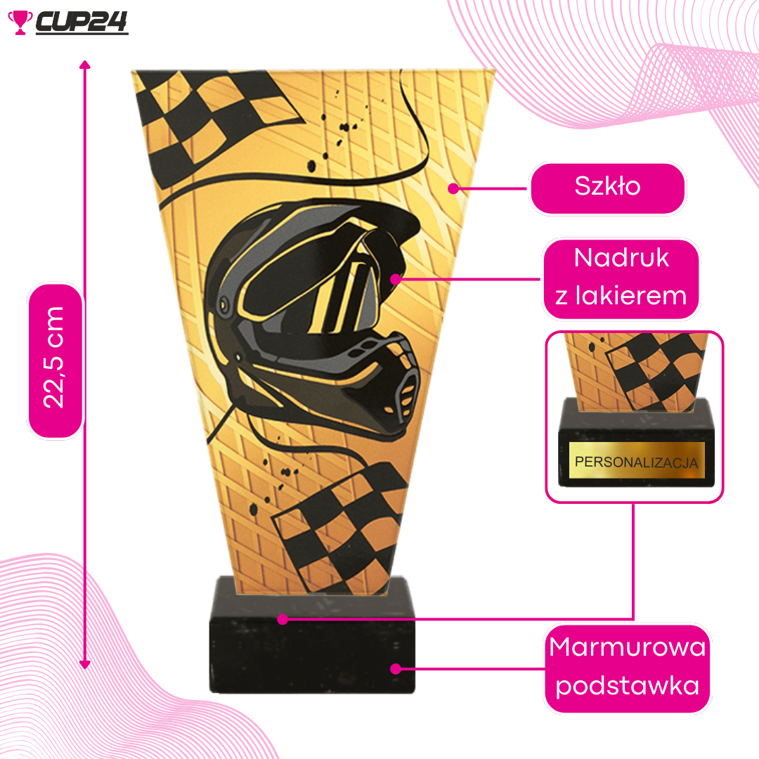 Wykonana z grubego, monochromatycznego szkła, statuetka zachwyca swoim wyglądem. Kolorowy nadruk motoryzacyjny, który możesz dostosować do swoich preferencji, sprawia, że jest to nagroda osobista i znacząca. Osadzona na solidnym, marmurowym podstawku, statuetka zyskuje na prestiżu i stabilności.