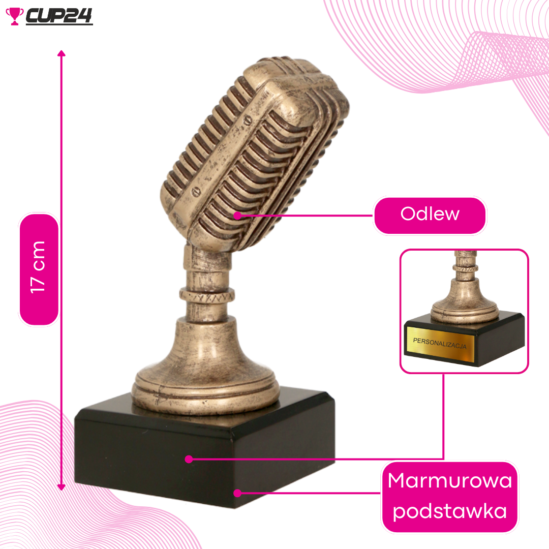 Statuetka RFST2079 jest doskonałym wyborem dla każdego, kto pasjonuje się muzyką i wokalem. Wykonana z wysokiej jakości metalu, przedstawia stylowy mikrofon w kolorze brązowo-złotym, co jest symbolem pasji i talentu wokalnego. Elegancki design statuetki oraz jej umieszczenie na czarnym, trwałym podstawku sprawiają, że jest to nie tylko nagroda, ale również piękny element dekoracyjny.
