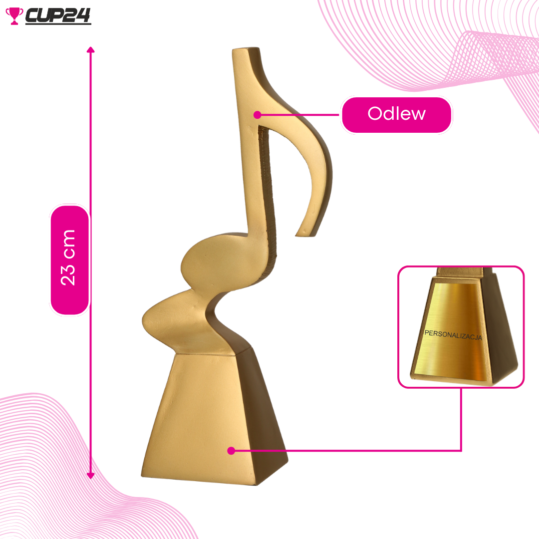 Statuetka muzyczna RP5016, mierząca 23 cm wysokości, wpisuje się w kategorię eleganckich i stylowych statuetek odlewanych. Jej złoty kolor i symboliczne znaczenie czynią ją idealną nagrodą dla osób, które chcą docenić czyjąś pasję do muzyki oraz umiejętności muzyczne. To nie tylko wyraz uznania, ale również zachęta do dalszego rozwijania talentów i dzielenia się nimi z innymi.