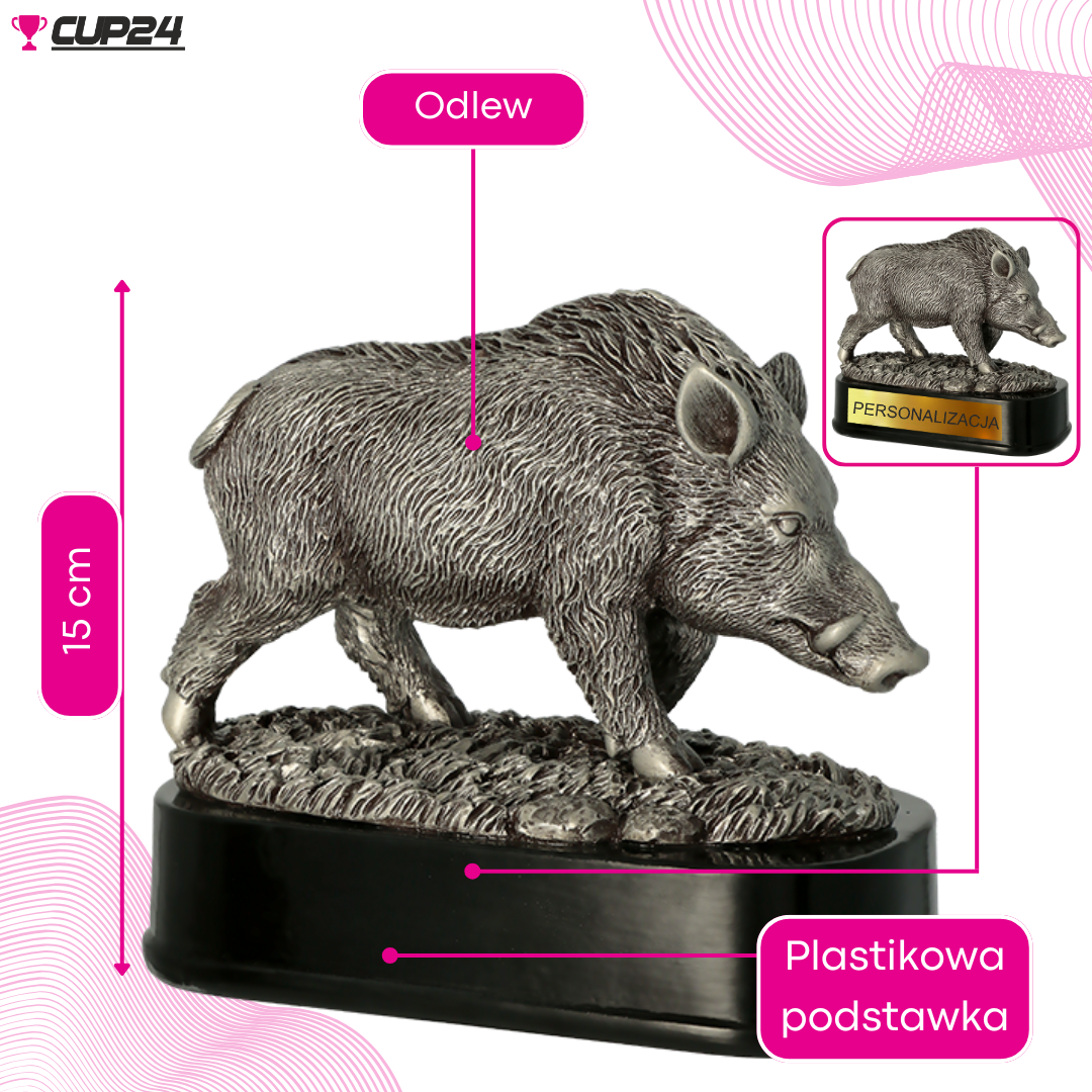 Należąca do kategorii statuetek odlewanych, statuetka z figurką dzika odznacza się elegancją i stylem, będąc nie tylko trofeum, ale także dziełem sztuki. Dzięki swojej jakości wykonania i realistycznemu wyglądowi, statuetka ta jest w stanie zadowolić nawet najbardziej wymagających miłośników łowiectwa i natury.