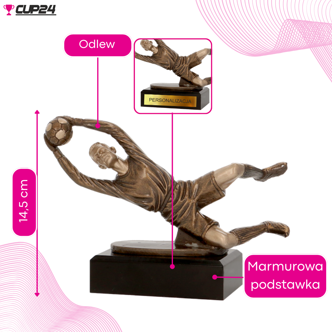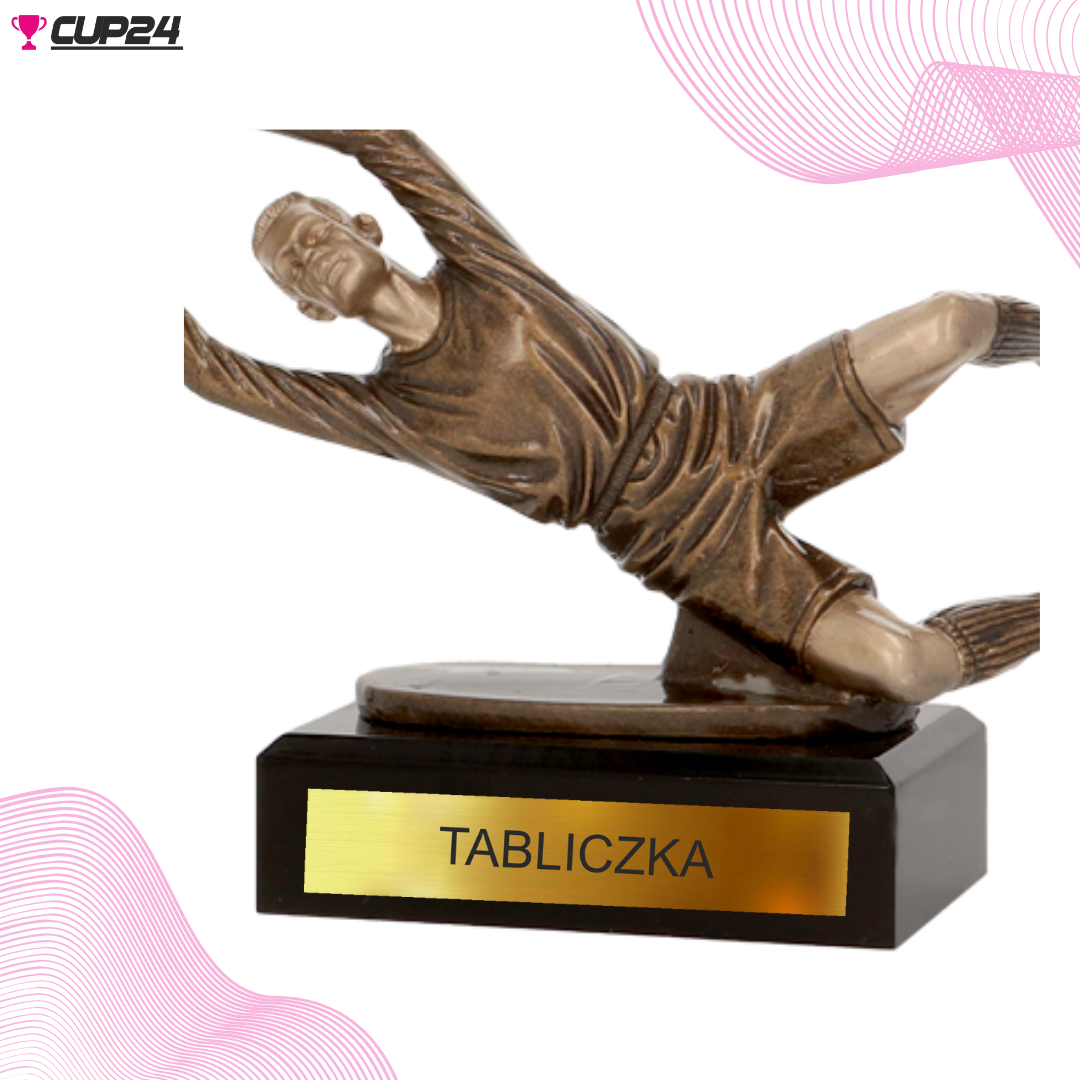 Ta statuetka odlewana jest hołdem dla bramkarzy, prawdziwych bohaterów piłkarskich boisk, którzy z determinacją i odwagą bronią swojej bramki. Przedstawiając bramkarza w akcji, z pełnym zaangażowaniem próbującego zatrzymać piłkę, statuetka oddaje dynamiczność i emocje towarzyszące obronie bramki. Jej nowoczesny kształt i elegancka kolorystyka podkreślają styl i kluczową rolę bramkarza w drużynie.