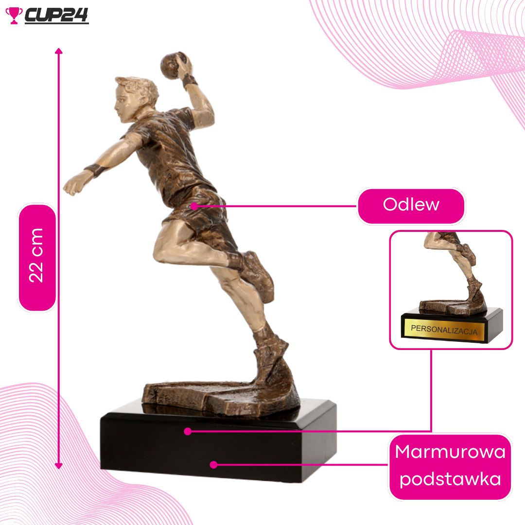 Przedstawiając szczypiornistę w akcji rzucającego piłkę, symbolizuje pasję i zamiłowanie do gry w piłkę ręczną. Figurka ma 22 cm wysokości, 12 cm szerokości oraz 10 cm głębokości, waży 0,5 kg, a jej biały kolor z czerwonymi akcentami dodaje uroku i podkreśla sportowy charakter. Na podstawie figurki można umieścić tabliczkę z możliwością personalizacji, co czyni ją idealnym prezentem dla każdego szczypiornisty, który zasłużył na podziękowanie czy uznanie. Należy do kategorii figurki odlewane, co gwarantuje wysoką jakość wykonania i atrakcyjność wizualną.