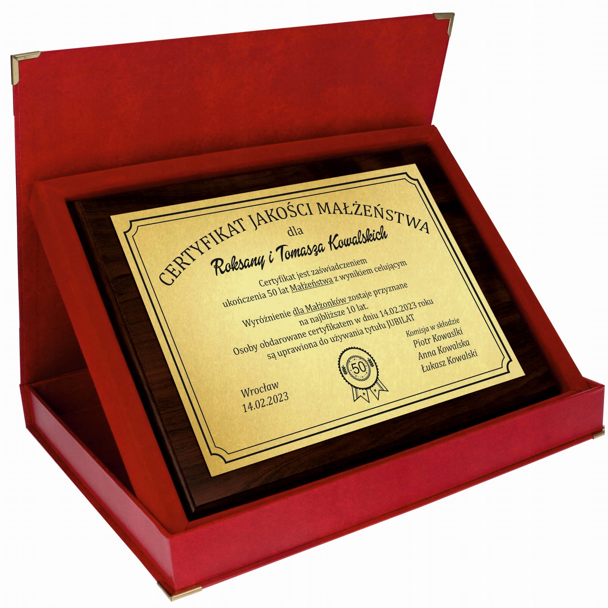Każda rocznica ślubu to wyjątkowy moment, który warto uczcić w niepowtarzalny sposób. Nasz Magiczny Spersonalizowany Prezent to nie tylko elegancki, ale i sentymentalny upominek, który na długo pozostanie w pamięci obdarowanych. Certyfikat jest wykonany z najwyższej jakości materiałów, osadzony na solidnym drewnianym podkładzie z lakierowanej płyty MDF w kolorze ciemnobrązowym.