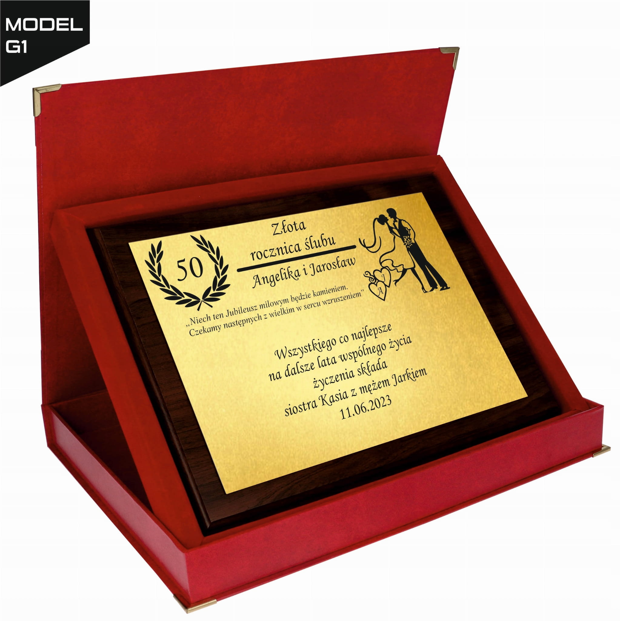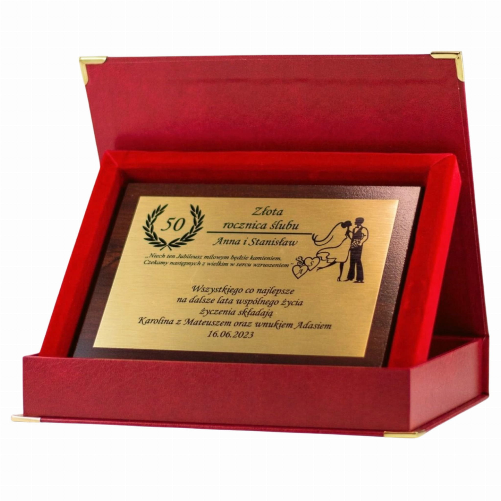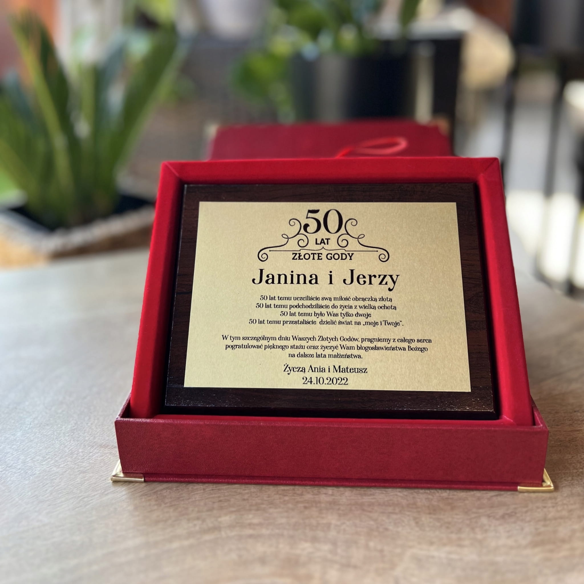 Personalizowana treść życzeń jest umieszczona na połyskującej złotej lub srebrnej blaszce, co nadaje całości wyjątkowego charakteru. Prezent dostępny jest w eleganckim etui, co czyni go gotowym do wręczenia, idealnym na każdą rocznicę ślubu – czy to 10, 25, 30 czy 50 lat małżeństwa.