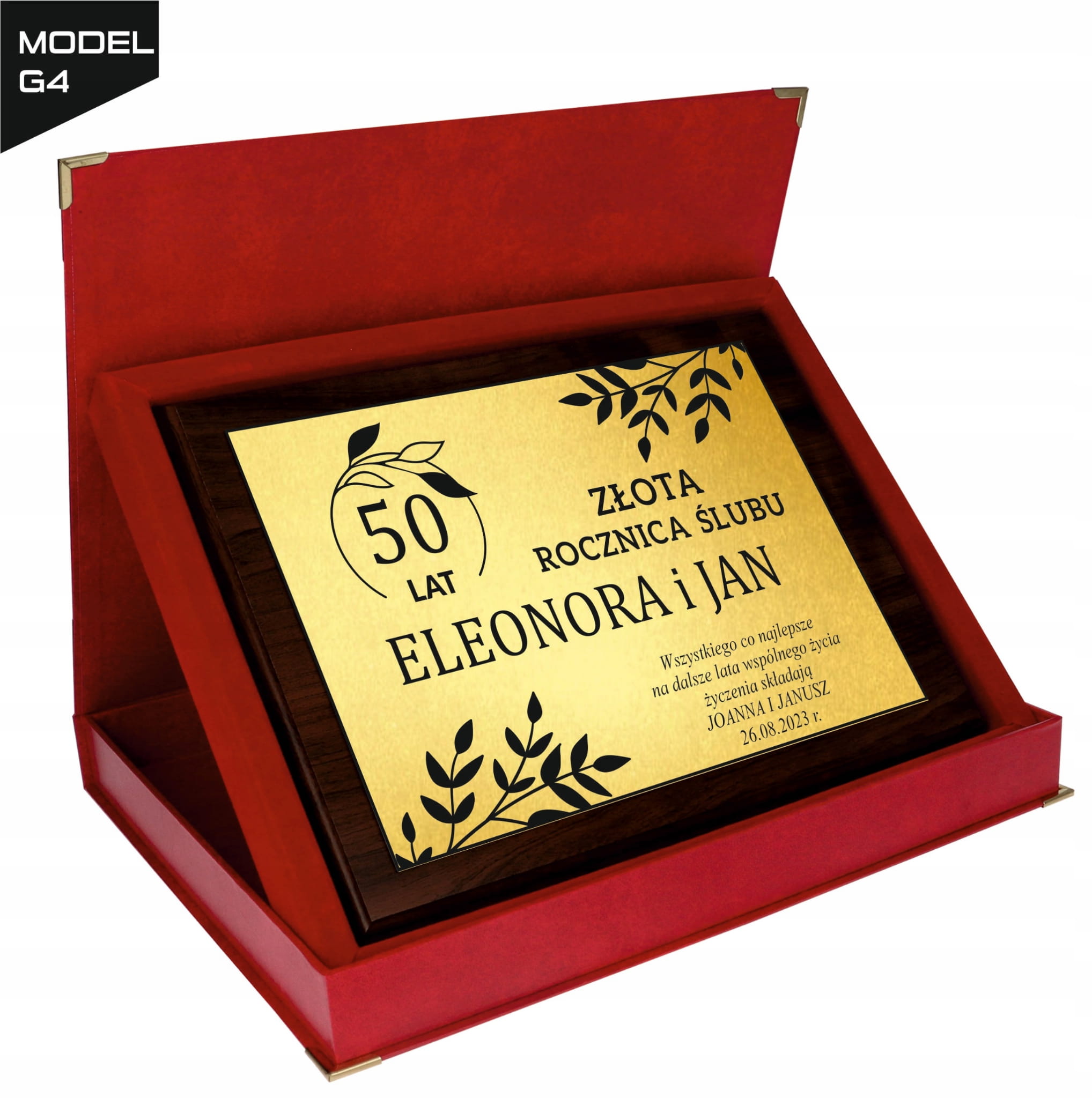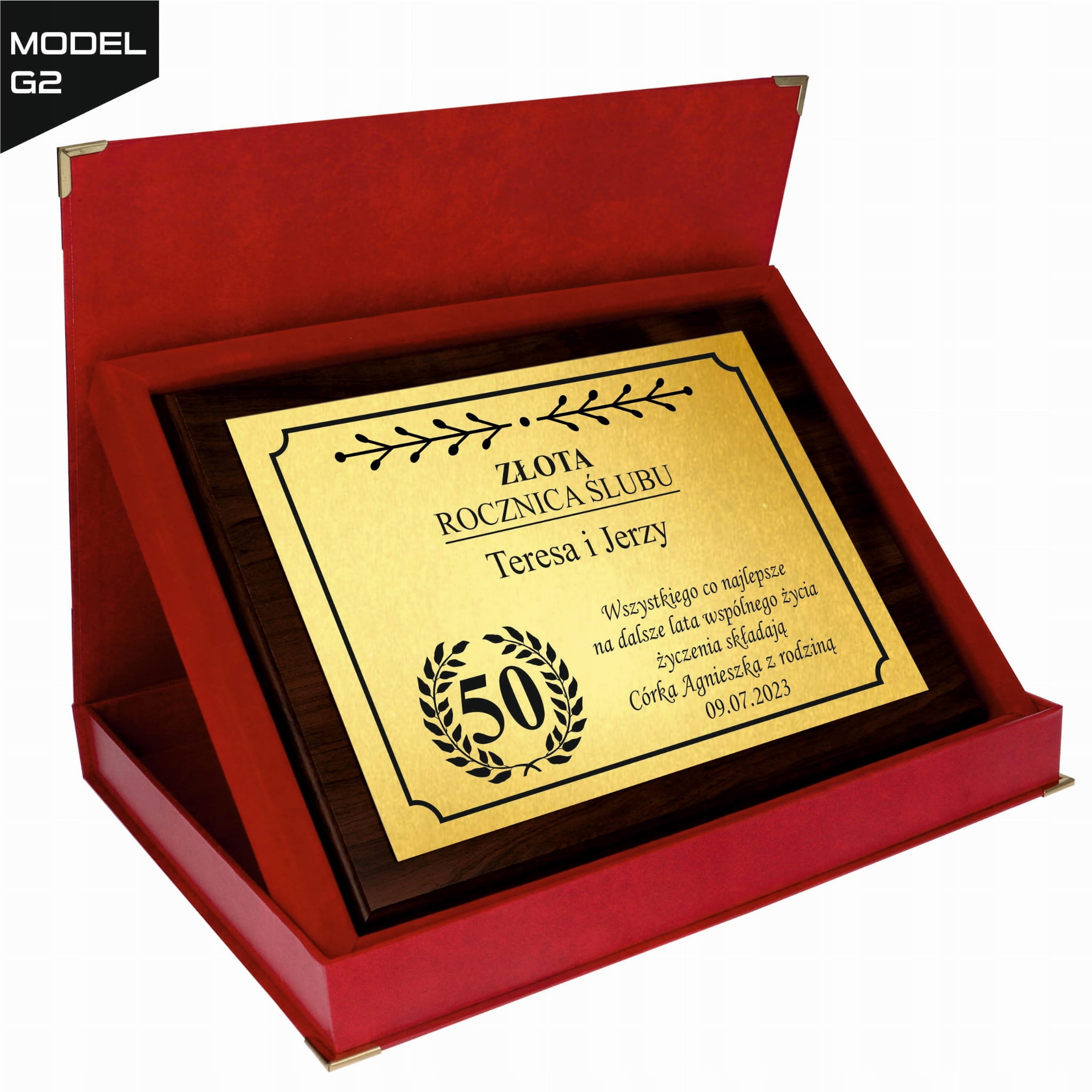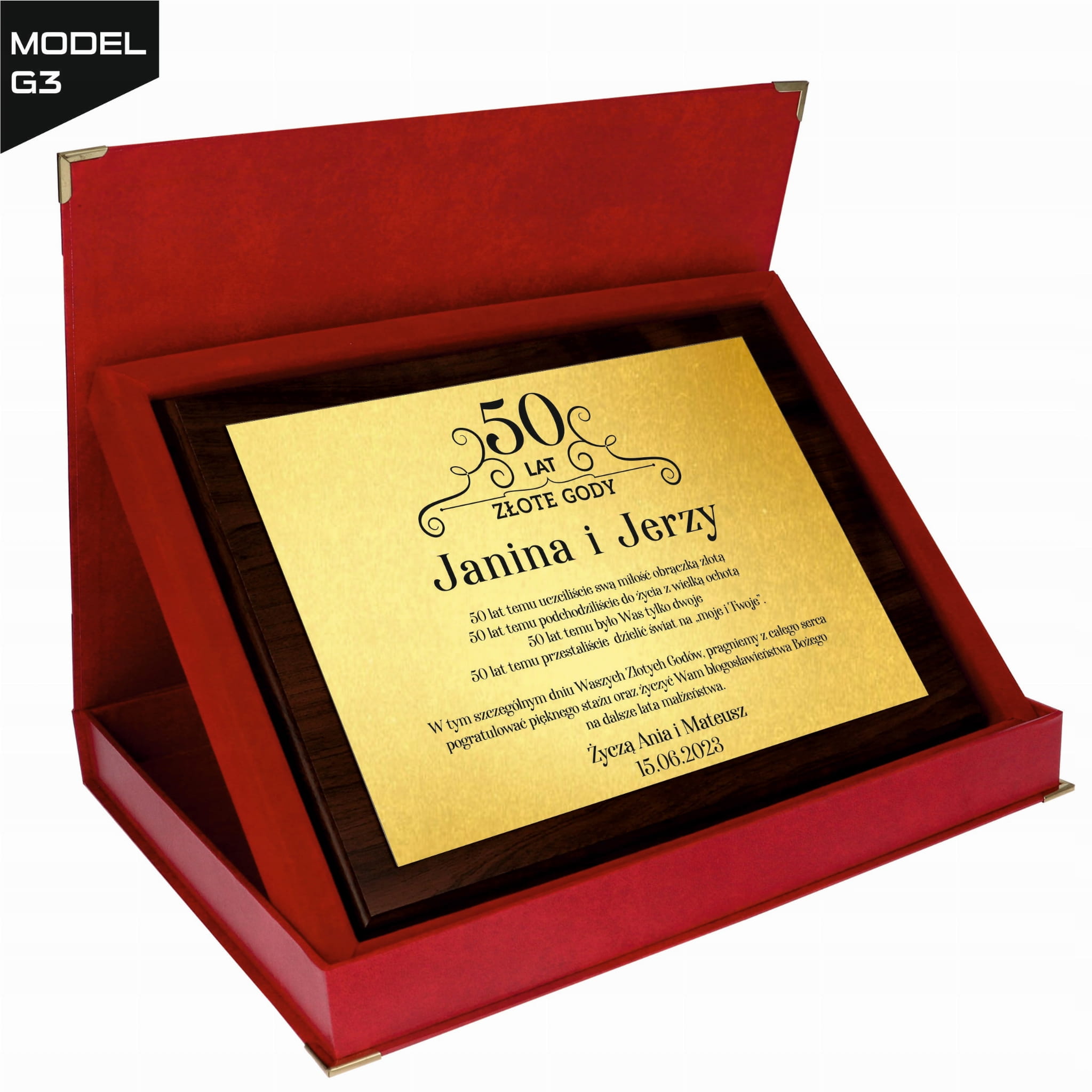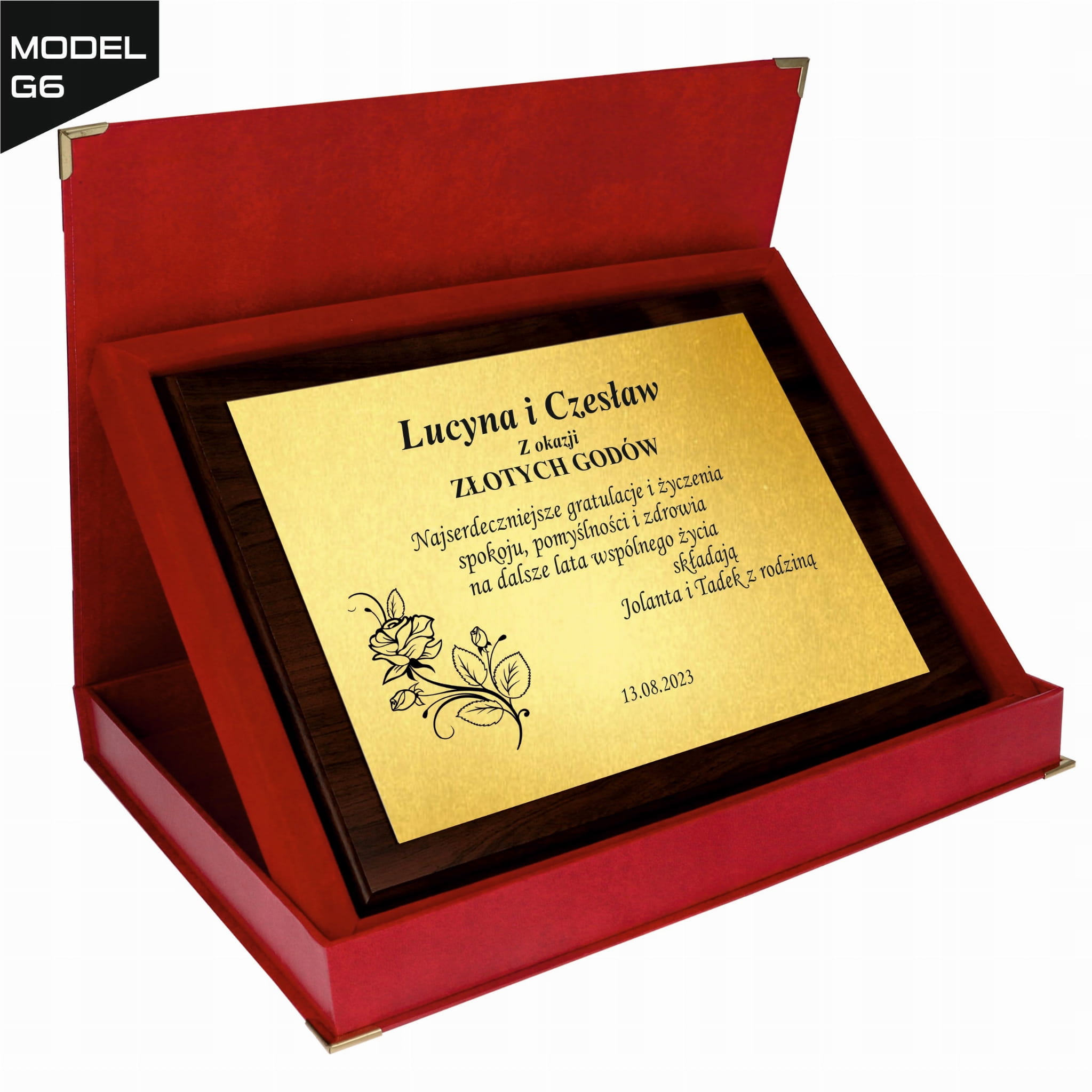 Personalizowana treść życzeń jest umieszczona na połyskującej złotej lub srebrnej blaszce, co nadaje całości wyjątkowego charakteru. Prezent dostępny jest w eleganckim etui, co czyni go gotowym do wręczenia, idealnym na każdą rocznicę ślubu – czy to 10, 25, 30 czy 50 lat małżeństwa.