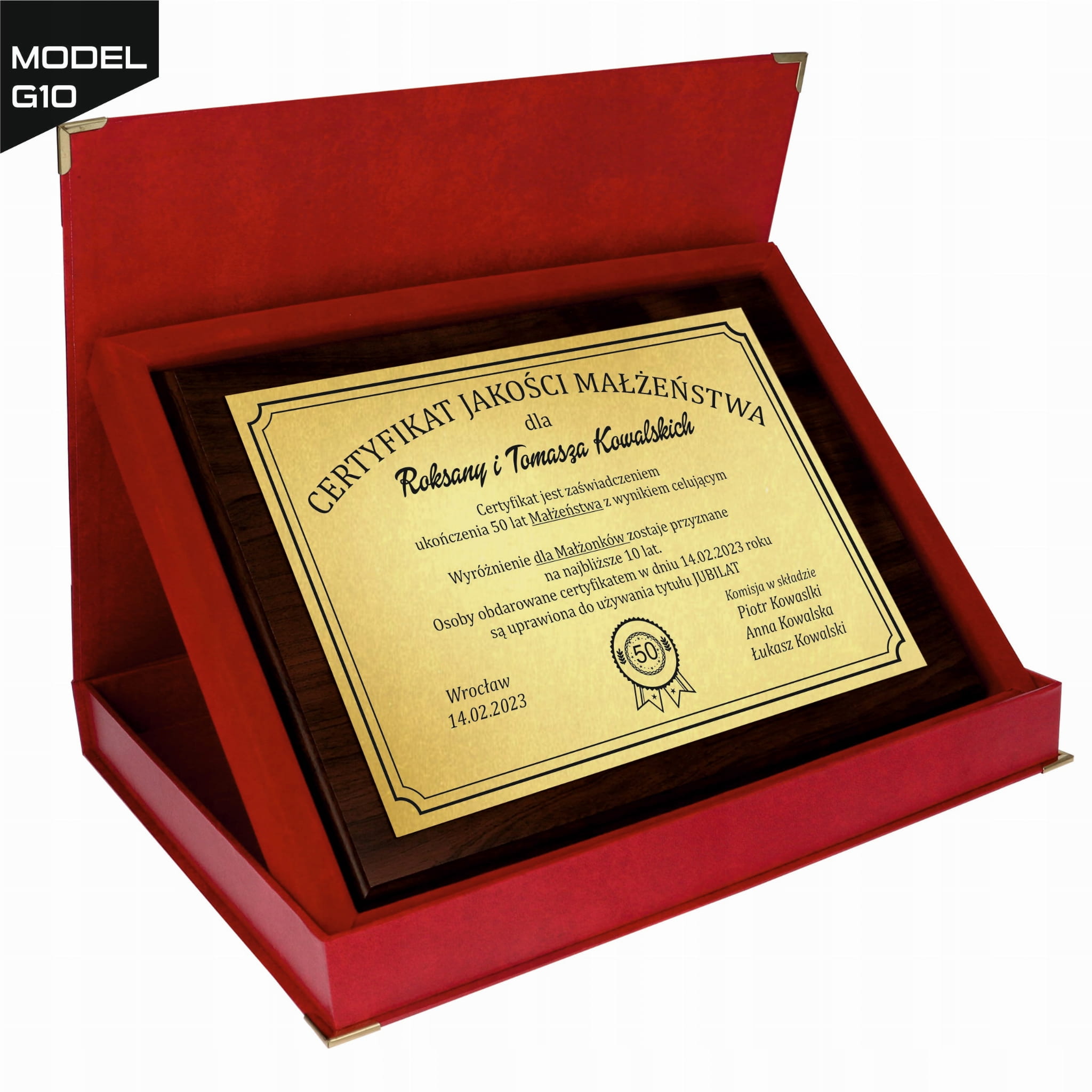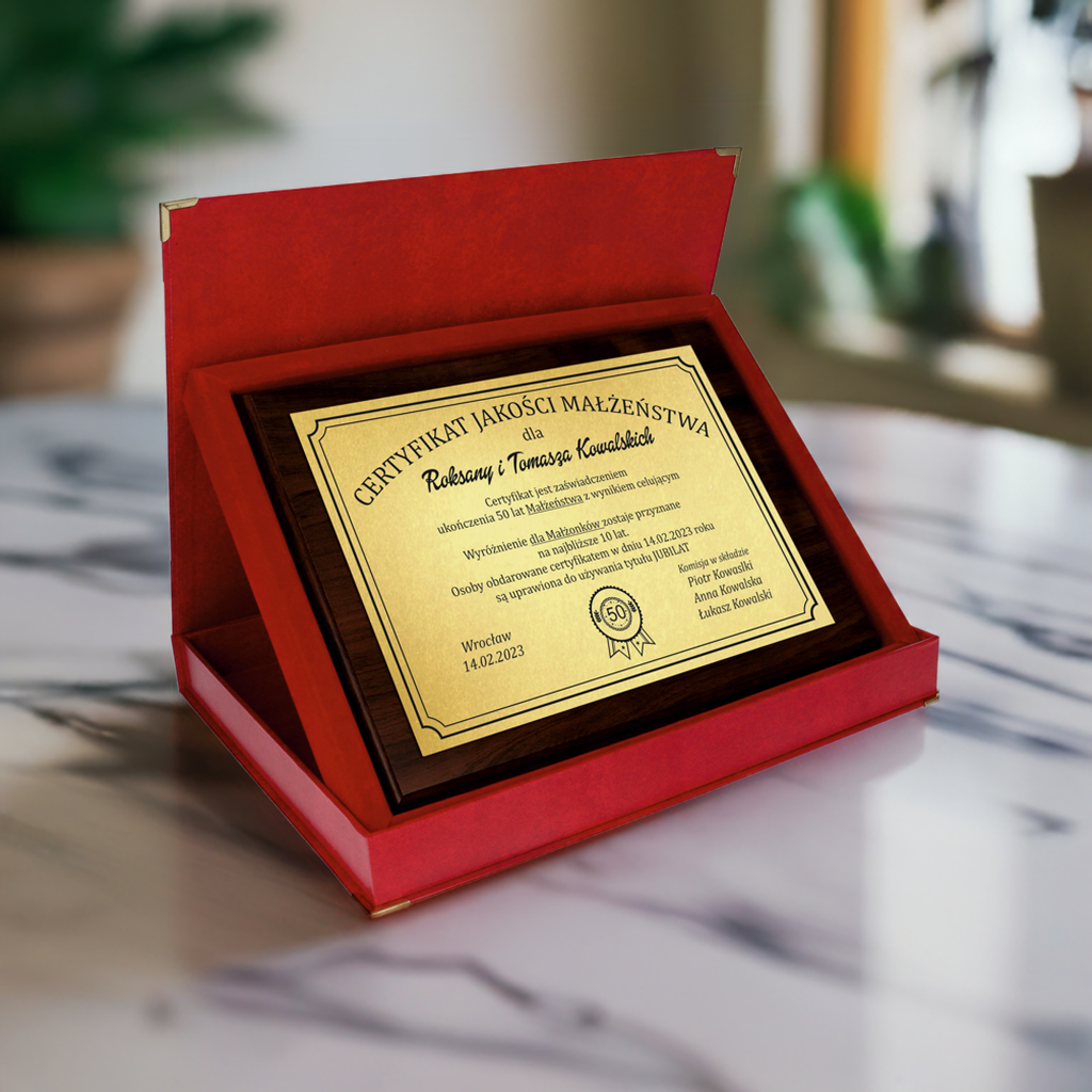 Uczcij wyjątkową rocznicę ślubu pięknym, spersonalizowanym prezentem! Ten elegancki certyfikat wykonany na złotej lub srebrnej blaszce, umieszczony na solidnym drewnianym podkładzie, to idealny sposób na wyrażenie uczuć i upamiętnienie ważnych chwil. Z dedykacją i personalizacją w cenie – wspaniały wybór na jubileusz 10-50 lat. Doskonały zarówno na rocznicę ślubu rodziców, jak i przyjaciół czy wnuków.