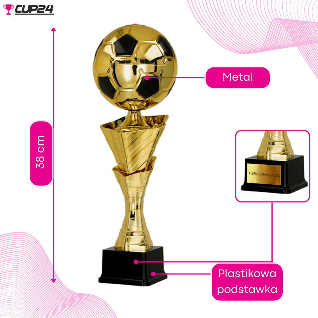 Puchar piłkarski metalowy złoty stanowi wyjątkową nagrodę dla fanów futbolu, łącząc w sobie elegancję i styl. Całkowicie złoty kolor podkreśla luksusowy charakter trofeum, a kielich w kształcie piłki nożnej umieszczony na oryginalnej stopce dodaje unikatowości.