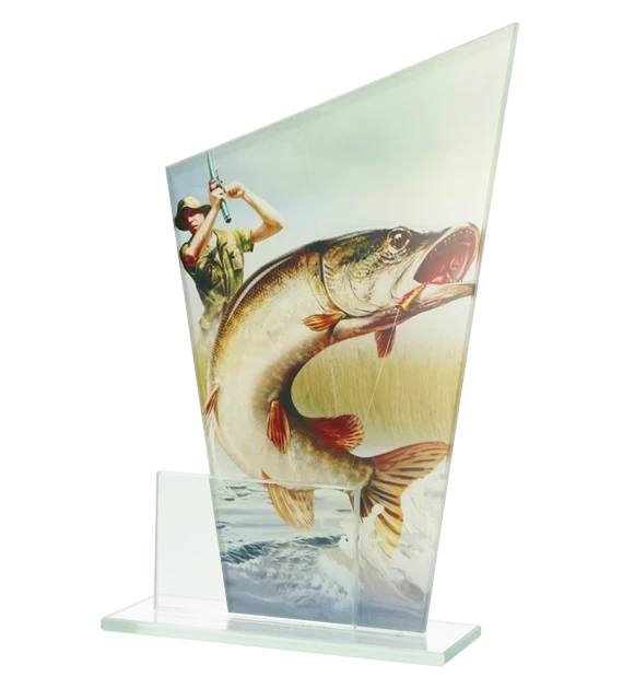Podaruj sobie lub swojemu znajomemu wędkarzowi niezapomnianą pamiątkę z łowiska - statuetkę szklaną z motywem wędkarskim. Statuetka przedstawia wędkarza z połowionym szczupakiem na tle błękitnej wody. Statuetka ma oryginalny kształt, składający się z dwóch tafli szkła. Pierwsza z nich jest ozdobiona nadrukiem z wizerunkiem wędkarza, a druga służy do personalizacji statuetki. Możesz wybrać dowolny tekst, który zostanie wygrawerowany lub nadrukowany na tabliczce. Statuetka jest wykonana z wysokiej jakości szkła, które pochodzi z naszej własnej produkcji. Statuetka ma następujące wymiary: