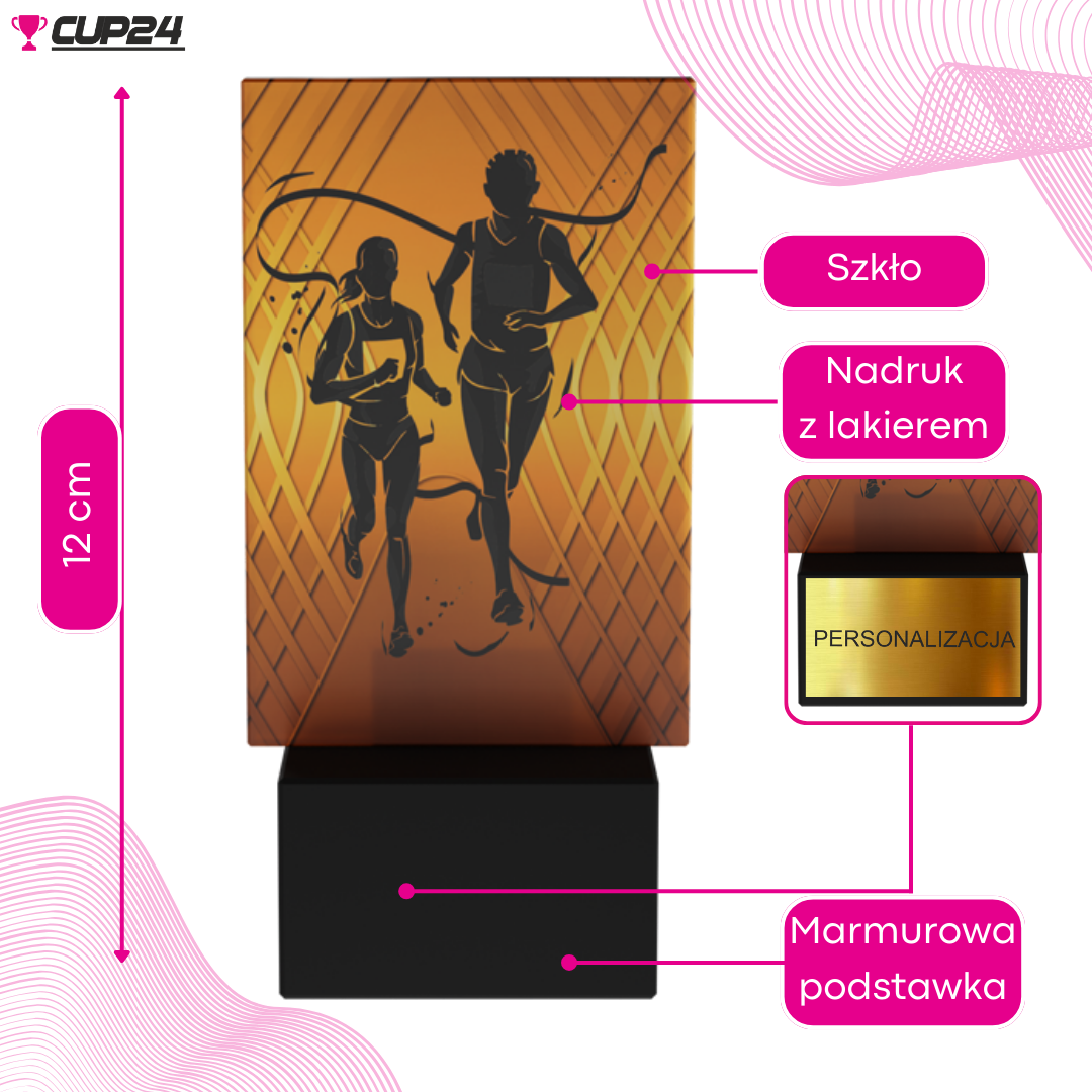 Mini trofeum z serii Amber Line to wyjątkowa statuetka, idealna dla biegaczy chcących uhonorować swoje osiągnięcia lub podziękować osobom wspierającym ich w pasji biegowej. Również organizatorzy zawodów biegowych znajdą w niej oryginalny sposób na nagrodzenie uczestników. Wykonane z eleganckiego szkła z indywidualnym motywem biegowym i możliwością dostosowania napisu, trofeum z pewnością zrobi wrażenie na każdym laureacie.