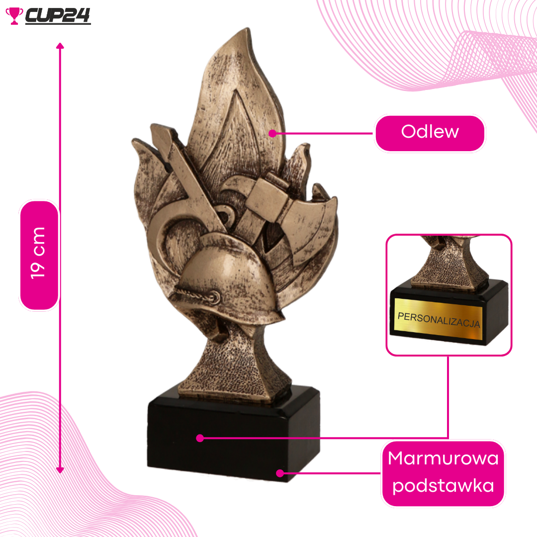 Wykonana z wysokiej jakości metalu, statuetka przedstawia akcesoria strażackie - hełm i toporek na tle płomieni, co symbolizuje niebezpieczeństwa i ryzyko związane z zawodem strażaka. Ten mocny wizualny akcent podkreśla odwagę i poświęcenie, jakie niesie ze sobą służba w straży pożarnej.
