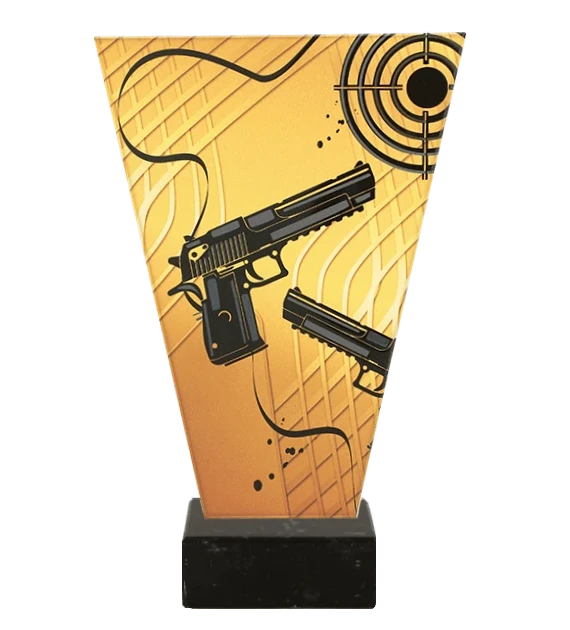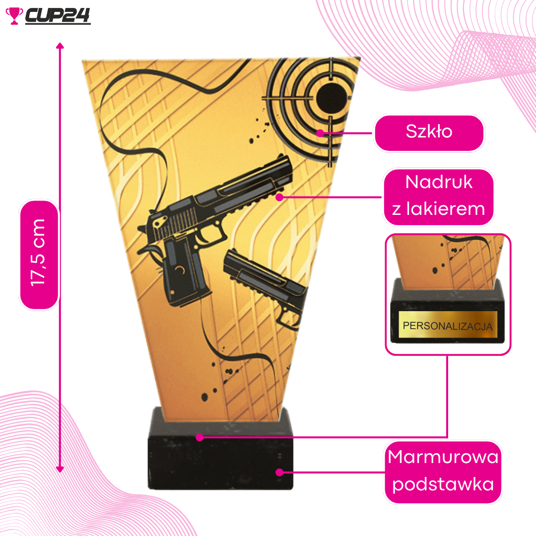 Wykonana z grubego szkła o wysokości 22,5 cm i grubości 1 cm, statuetka posiada monochromatyczny nadruk z grafiką broni krótkiej, co podkreśla związane z nią umiejętności celności i precyzji. Osadzona na czarnej, marmurowej podstawie, dodaje elegancji i zapewnia stabilność. Istnieje możliwość personalizacji poprzez zamówienie tabliczki, którą wykonamy techniką graweru laserowego lub nadruku kolorowego. Wymiary tabliczki to 23x63 mm, co pozwala na umieszczenie dowolnego tekstu.