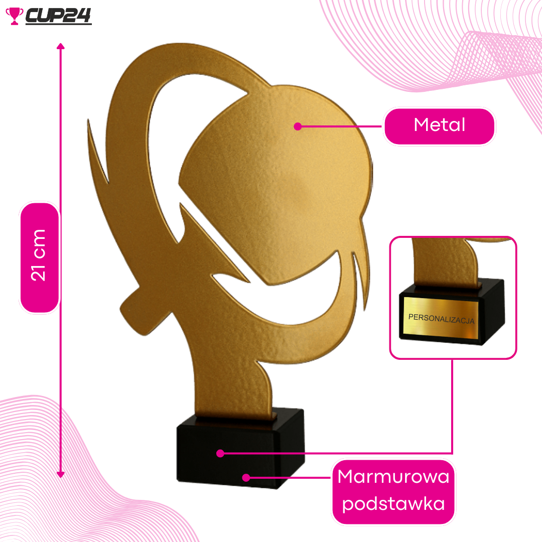 Wykonanie statuetki ze szczotkowanego metalu w złotym kolorze nadaje jej wyjątkowego blasku i elegancji, który przyciąga wzrok i podkreśla prestiż nagrody. Umieszczona na solidnej podstawie z czarnego marmuru, statuetka zyskuje dodatkową stabilność i szlachetność, czyniąc ją nie tylko trofeum, ale również wyjątkowym elementem dekoracyjnym.