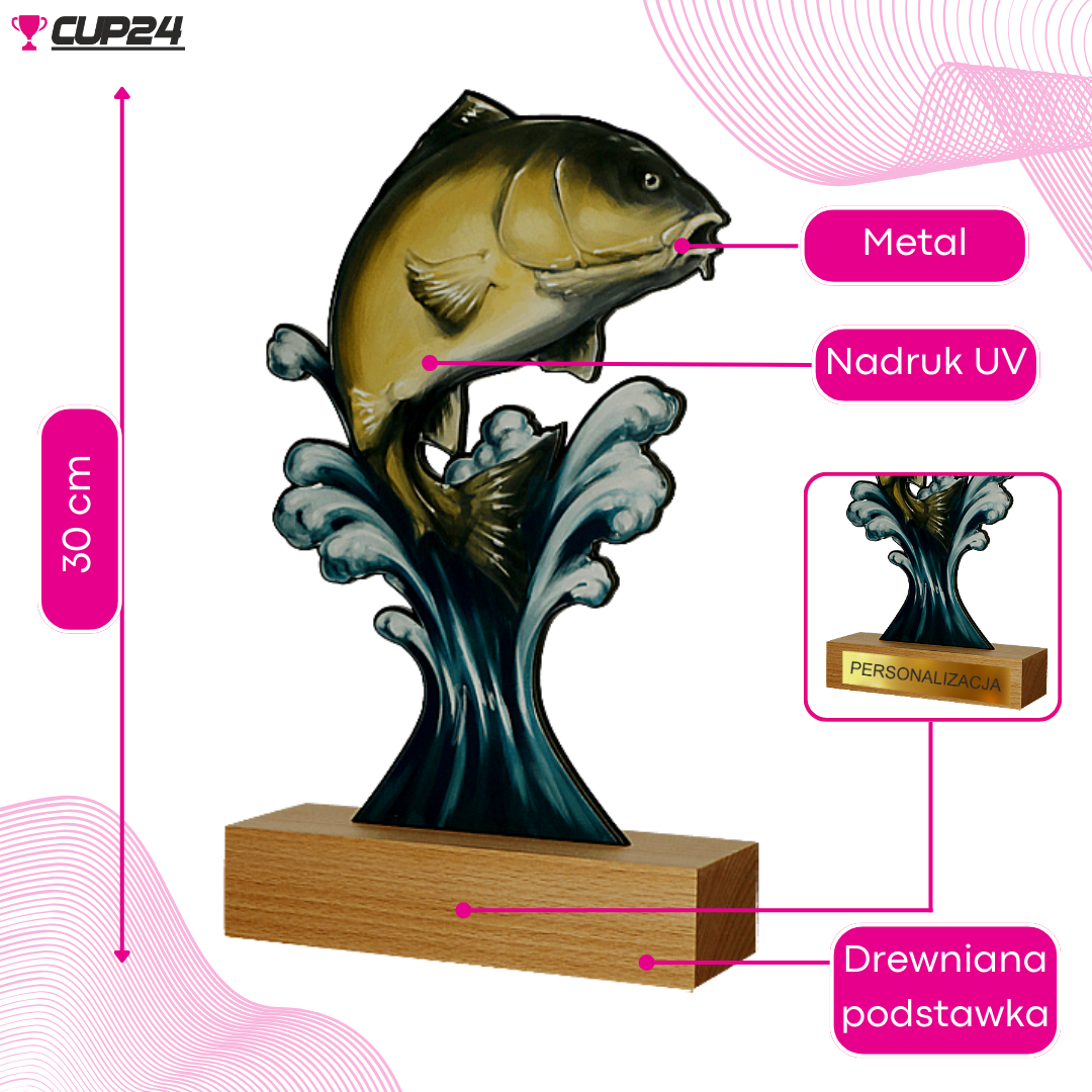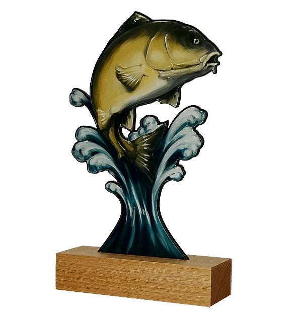 Statuetka WL-FIS1 to nie tylko nagroda, ale prawdziwe arcydzieło, które oddaje hołd wędkarskiej pasji. Wykonana z metalu o grubości 5 mm i precyzyjnie wycięta laserowo, ta statuetka w kształcie karpia jest imponującym trofeum dla zwycięzców zawodów wędkarskich. Detale takie jak łuski i oczy ryby, oddane z niezwykłą szczegółowością dzięki kolorowemu nadrukowi UV, przemawiają do wyobraźni, celebrując piękno jednej z najbardziej cenionych ryb słodkowodnych.