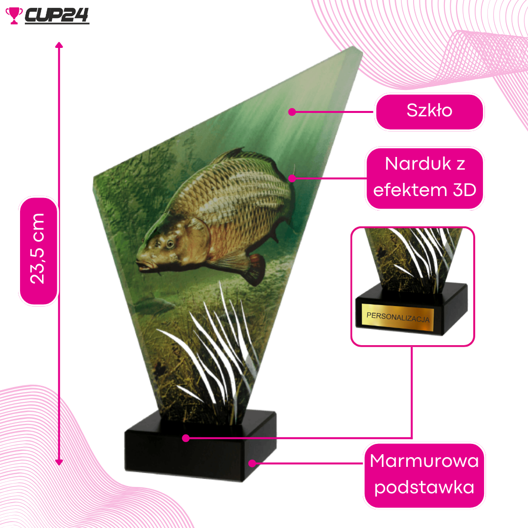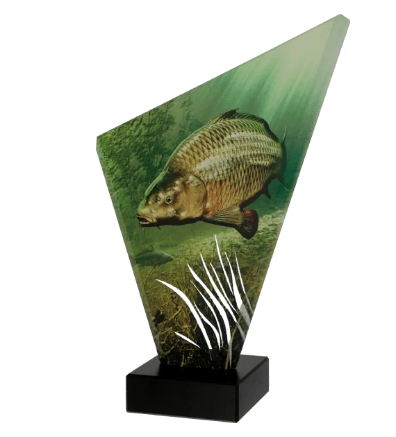 Wykonana z grubego szkła o pięknym połysku i głębi kolorów, statuetka wyróżnia się niepowtarzalnym nadrukiem z motywem karpia, co nadaje jej sportowego charakteru.