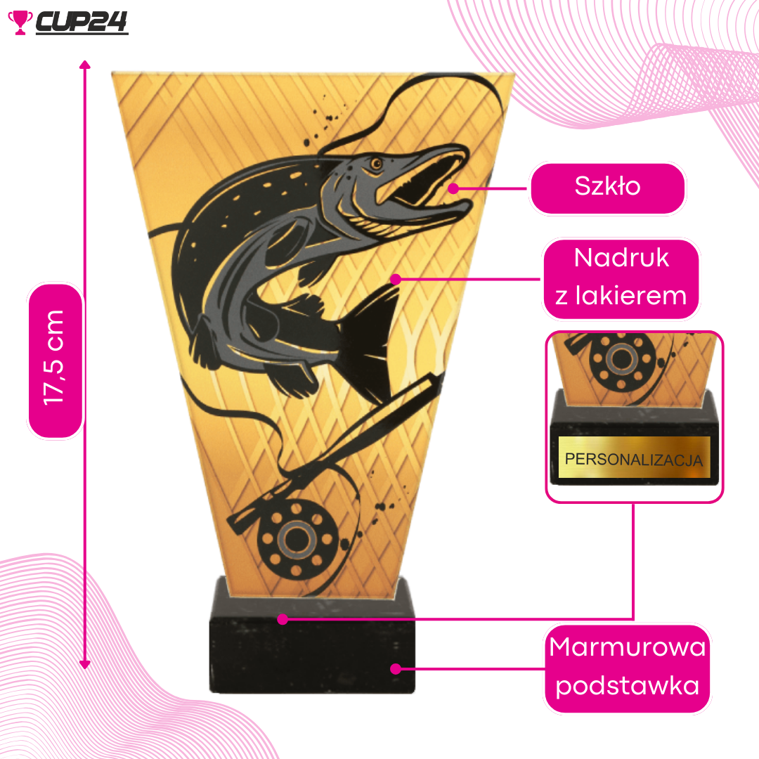 Ta statuetka wykonana z grubego szkła o wysokości 17,5 cm i grubości 1 cm, ozdobiona jest kolorowym nadrukiem przedstawiającym symbole wędkarstwa. Na solidnej, czarnej, marmurowej podstawie można umieścić tabliczkę z indywidualnym tekstem, co pozwala na wyrażenie osobistego przesłania. Dostępność ponad 50 wzorów umożliwia dopasowanie do każdego gustu i wnętrza, a tabliczka o wymiarach 22x54 mm oferuje wystarczająco dużo miejsca na personalizację poprzez grawer laserowy lub nadruk kolorowy.