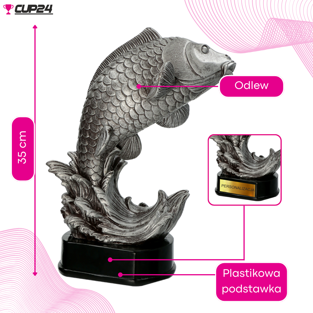 Z wysokością 30 cm, statuetka stanowi imponujące wyróżnienie, które z pewnością zajmie honorowe miejsce w domu każdego wędkarza. Jest to oryginalny i trwały prezent, który nie tylko będzie piękną ozdobą, ale także wyrazem uznania dla pasji i umiejętności łowienia ryb.